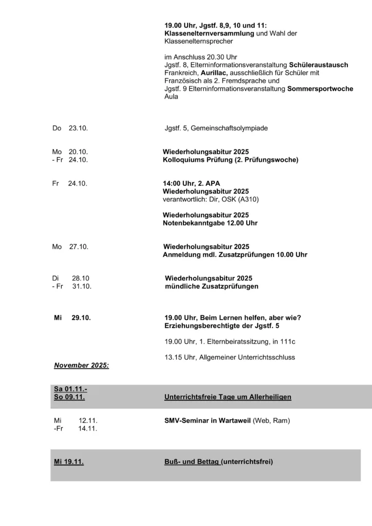 Sie finden hier neben dem Terminkalender des aktuellen Monats auch den Sprechstundenplan für das erste Halbjahr. Beim Öffnen des PDF-Dokuments werden Sie aufgefordert Zugangsdaten einzugeben. Diese Zugangsdaten wurden Ihnen zu Beginn des Schuljahres mit dem ersten Mitteilungsblatt übermittelt.
