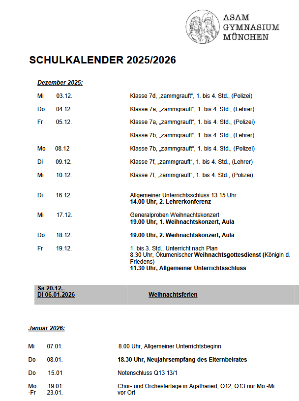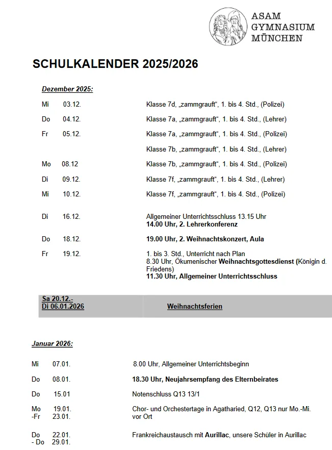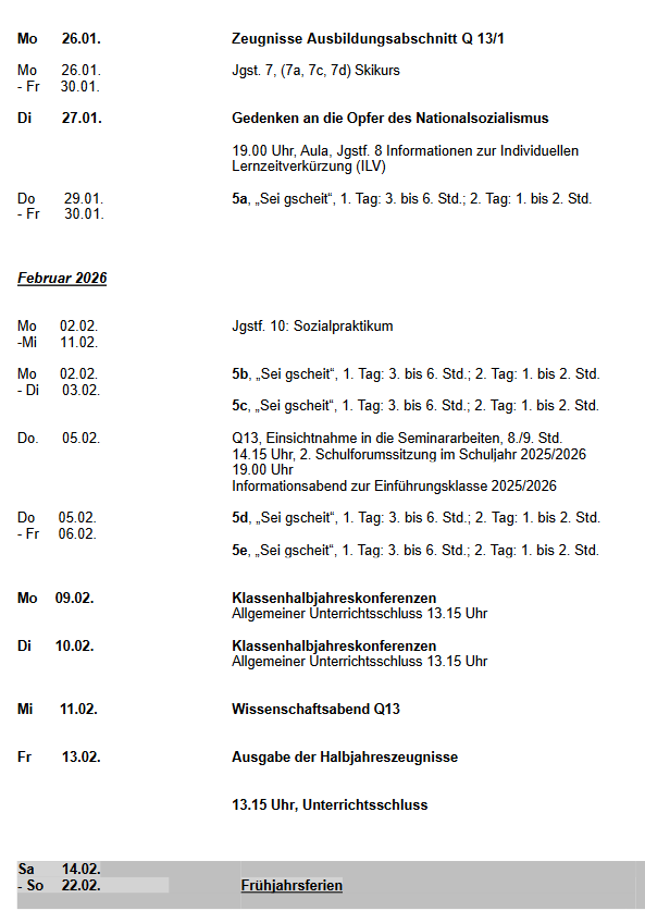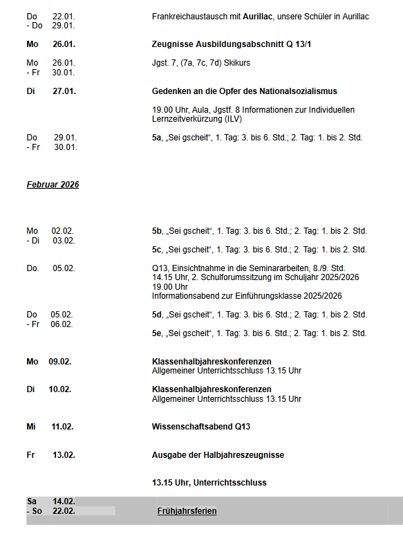 Sie finden hier neben dem Terminkalender des aktuellen Monats auch den Sprechstundenplan für das erste Halbjahr. Beim Öffnen des PDF-Dokuments werden Sie aufgefordert Zugangsdaten einzugeben. Diese Zugangsdaten wurden Ihnen zu Beginn des Schuljahres mit dem ersten Mitteilungsblatt übermittelt.